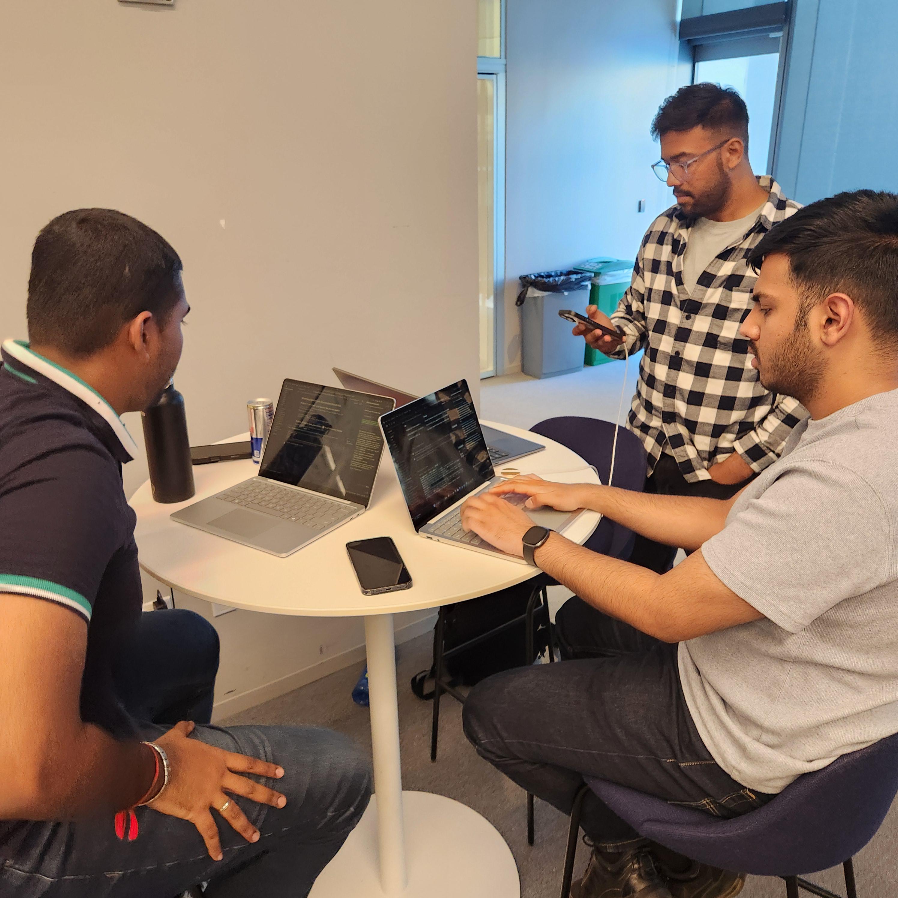 9:30 AM — Hacking begins. The room dropped into focused silence punctuated by bursts of discussion. Sponsor engineers circulated, helping teams integrate APIs and debug architecture decisions. The energy was concentrated — no panels, no keynotes, just building.